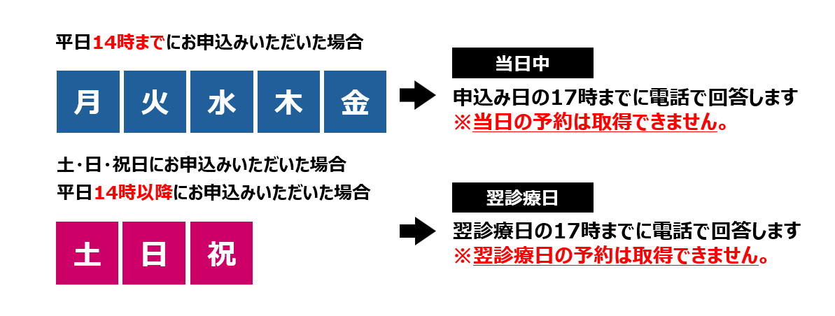 - 平日(月~金)の14時までの予約申込みは当日中にお電話で回答いたします。14時以降、または土日祝の申込みの場合は翌外来診療日の回答となります。