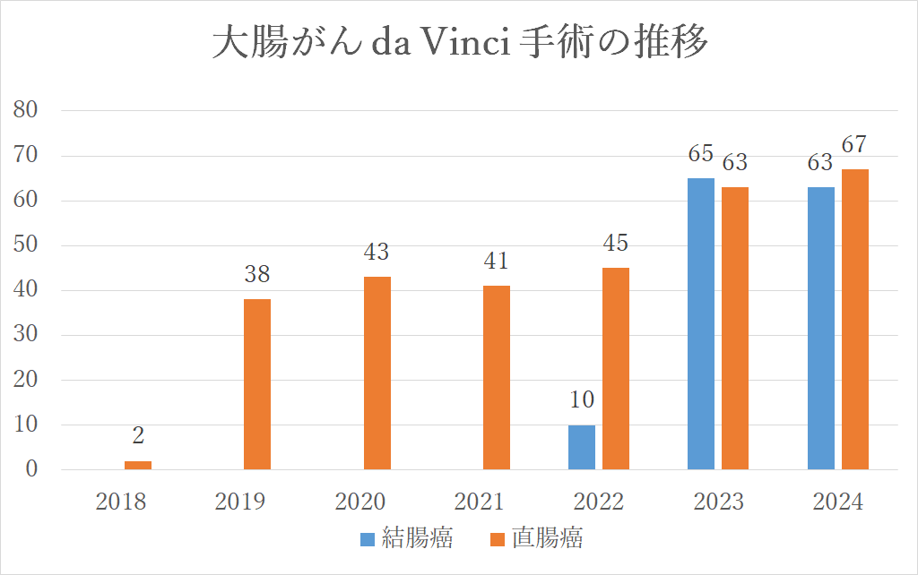 大腸癌に対するロボット手術は、2018年に「直腸切除、直腸切断術」が、2022年には「結腸悪性腫瘍手術」が保険適用となりました。これによりすべての大腸癌患者さんにロボット手術を受けていただくことが可能となり、当院ではいずれのロボット手術も実施しています。
