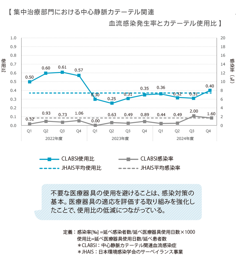 感染制御チームは医師・看護師・薬剤師・臨床検査技師・事務と多職種で構成されており、看護師3名と事務1名については専従で活動しています。年間目標の設定にあたっては感染対策に関連したデータを収集・評価し、100以上の項目の中から優先度の高いものに絞り込み取り組みを進めています。特に当チームでは2022年度以降に医療器具関連感染対策に注力しており、全ての集中治療部門と入院病棟を対象に、人工呼吸器・血管内留置カテーテル・膀胱留置カテーテルなどの医療器具関連感染率や感染対策バンドル遵守率を算出し、データに基づいた改善活動を展開できるよう感染防止担当者を支援しています。