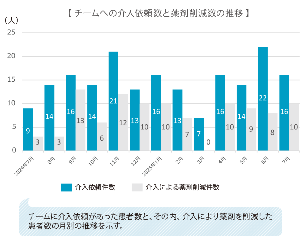 2023年6月に発足した新チームで、病棟スタッフ(医師、看護師、薬剤師など)から減薬や薬剤の不適切使用などについて相談のあった患者さんに対し、薬剤適正使用を行うための多職種カンファレンスを定期開催しています。患者さんの同意を得たうえで薬剤調整についてチームでカンファレンスを行い、結果は主治医にフィードバックします。その後は病棟スタッフと連携してその後の治療評価を継続して行います。また、病棟スタッフからの申し出に応じて入院中に薬剤調整があった患者さんの薬剤レビューも行っています。