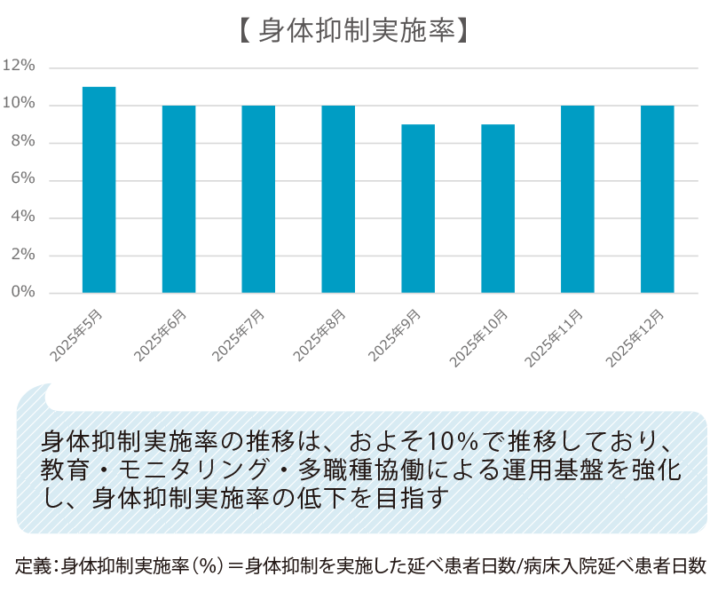 身体的拘束を最小化する取組みを強化し、患者さんの尊厳を守るケアの実施と身体拘束ゼロを目指す