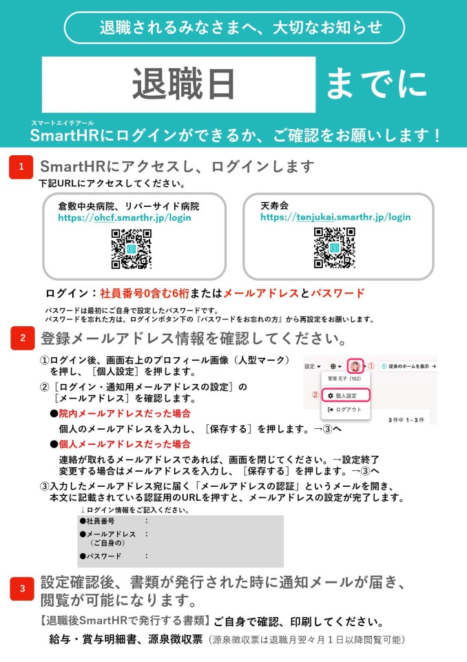 本年分の『給与所得の源泉徴収票』は、SmartHRにてご確認いただきます。退職日の翌々月1日から閲覧(印刷)が可能です。