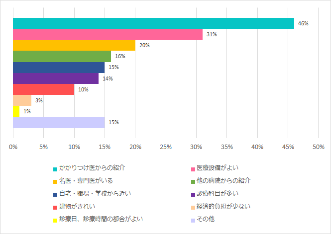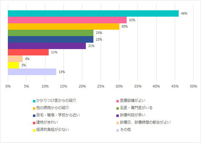 「かかりつけ医からの紹介」「医療設備が良い」「名医・専門医がいる」という理由で、当院を選ばれている患者さんが多いことが分かります。