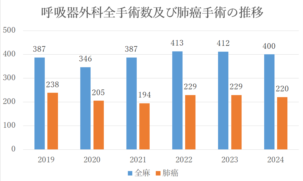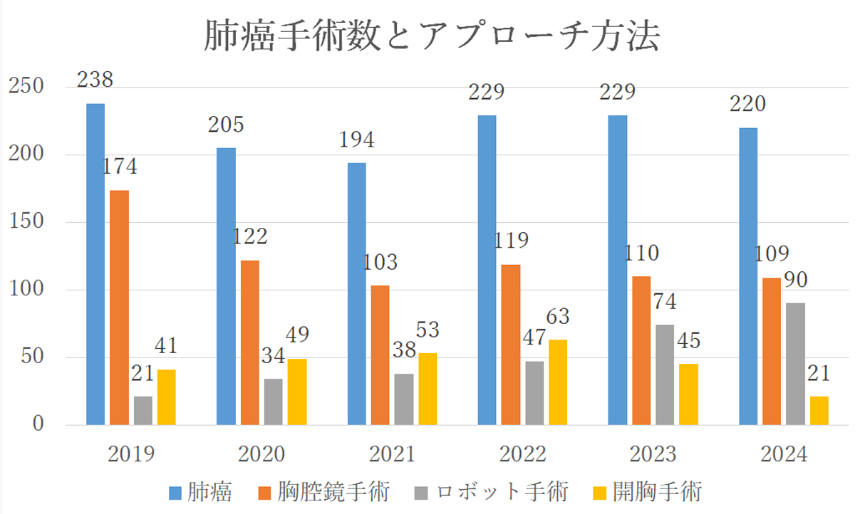 また、ここ数年は高齢化が進み、80歳代の手術も増加傾向であり、肺癌手術のうち毎年15-6%を占めています。術前の評価を慎重に行い、術前よりリハビリテーション、口腔ケア、栄養療法を開始します。術後もこれらを継続することにより、術後合併症を減らして元気に退院していただくことを目標に周術期管理を行っています。