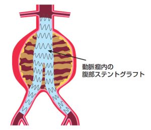 「ステントグラフト」は、人工血管(グラフト)に、金属のワイヤーでできた編み目状の網(ステント)を組み合わせた医療機器です。ステントグラフトをカテーテルの中に収めて、足の付け根の血管から体の中に挿入します。対象の動脈瘤の場所まで進め、そこで広げることで弱くなった血管を内側から補強し、動脈瘤に血液が流れ込まないようにします。手術は全身麻酔で行います。
