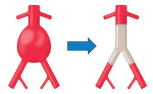 従来から行われている治療方法です。腹部を切開して動脈瘤の上下で血流を遮断した後に、人工血管に取り替えます。腹部を切開するため全身への負担が大きく、一定期間の入院や食事制限があります。手術成績、長期成績ともに良好です。高齢であったり、他の病気(心臓病、肺の病気、腎臓病)を抱えていたり、過去に腹部の手術を受けたことがある方はリスクが高いため、治療方法を検討します。