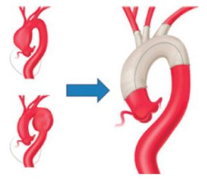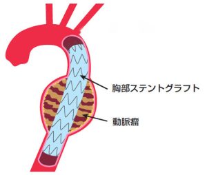従来から行われている治療方法です。全身麻酔のもとで左胸部から肋骨を数本を切開して動脈瘤の上下で血流を遮断したうえで、人工血管に取り替える手術です。胸部を大きく切開することや片肺での全身麻酔を行うことなどで、全身への負担が大きくなり、一定期間の入院生活や食事の制限があります。手術成績、長期成績は良好です。しかし、ご高齢であることや他の病気(心臓病、肺の病気、腎臓病)が並存していたり、過去に胸部の手術の既往がある場合は手術を選択しない場合があります。