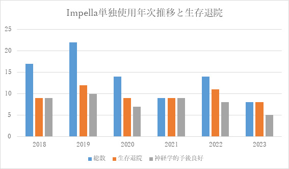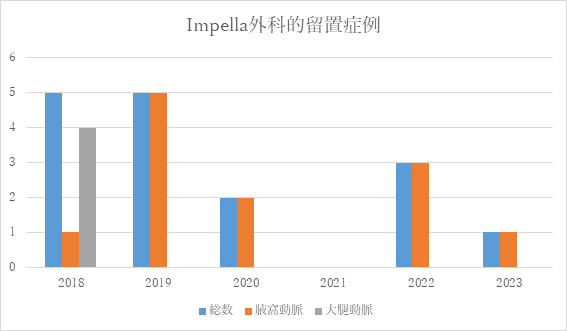 5年間で115人の患者さんにImpellaを使用し、55人(48%)ではVA ECMOと併用しました。2023年にImpellaを単独で使用したのは8人で、全員(100%)が生存退院されました。VA ECMOとの併用は11例でした。また、うち1人は外科手術により、腕の動脈に人工血管をつなぎ、既存のImpellaを取り外してより強力な機種に入れ替える処置を行いました。