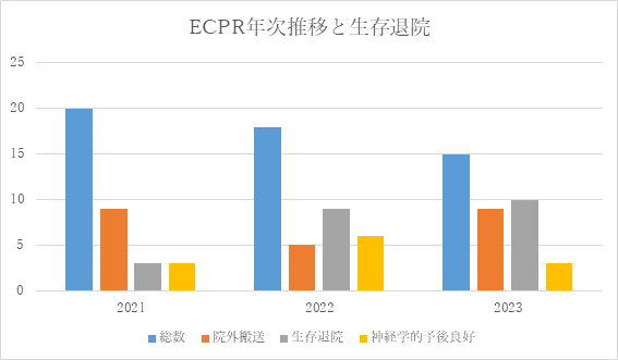 5年間で150人の患者さんにVA ECMOを使用し、そのうち54人(36%)が無事に退院されました。また、脳に大きな後遺症がなかった方(神経学的予後が良好:CPC 1または2)は44人(全体の29%)でした。2023年は24人にVA ECMOを使用し、15人(63%)が生存退院、そのうち10人(29%)は脳の機能にも大きな障害がなく退院されました。前年に比べて、生存率は向上しています。
