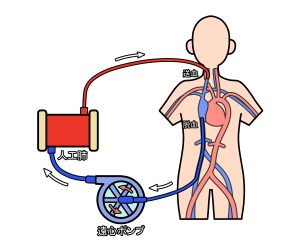 ECMOは「体外式膜型人工肺」と呼ばれる装置で、血液を体の外に取り出してポンプで循環させながら酸素を加えて再び体内に戻すという、心臓や肺の機能を一時的に代行します。