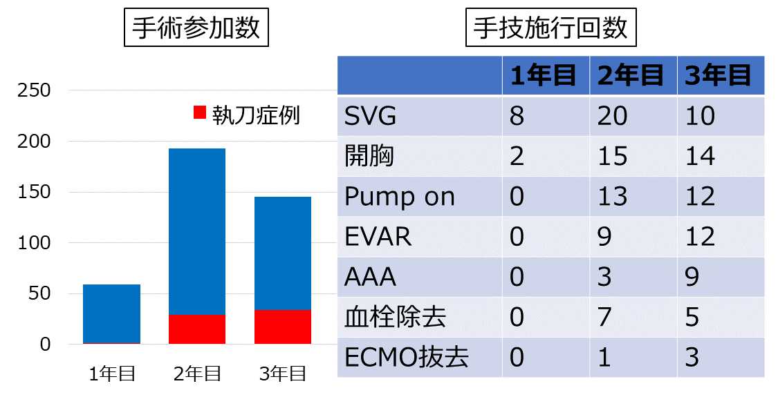 心臓大血管手術(約300件)、ステントグラフト(約100件)、TAVI(100-150件)、腹部・末梢血管手術(約100件)など、少人数の研修体制により1人あたりの執刀機会が多く、段階的に技術習得を進められる環境です。