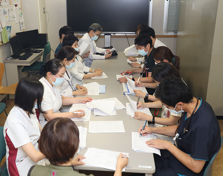 医師、看護師、臨床工学技士、MSWが参加するPDチームでカンファレンスを行っています。課題が生じた時、どの職種に相談するか明確になっており、課題の早期解決につながっています。