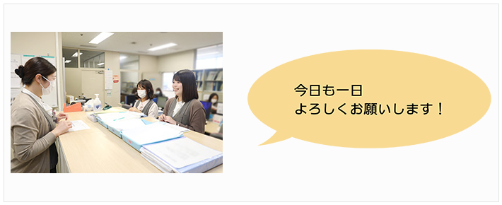 チームのスタッフと朝礼を行います。各病棟の業務の情報共有を行います。