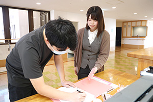 予定入院の患者さんが来院されたら、病室へご案内し、資格確認書の確認や入院書類の説明を行います。