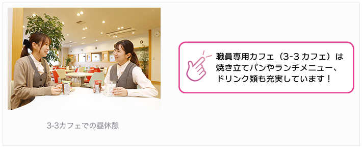 各部署の休憩室や、職員食堂で部署の先輩や同期と一緒にお昼休憩をとります。