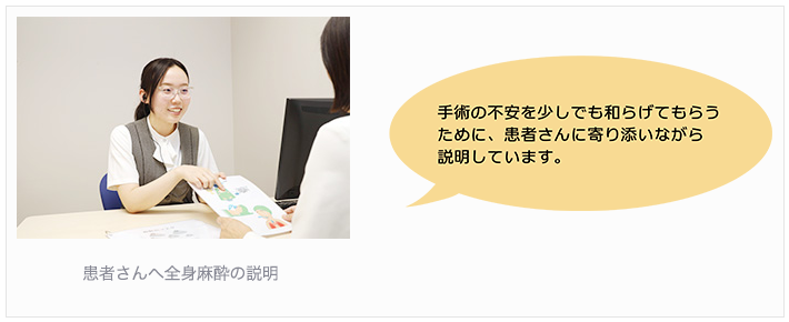 14:00*麻酔代行説明*術前外来で医師の指示のもと麻酔の代行説明を行い、麻酔科医師のサポートをします。