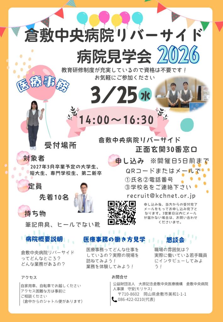 2025年11月14日 / 最終更新日 : 2025年11月14日 本倉 美乃里 採用情報 医療事務 病院見学会(リバーサイド)(2027年3月卒業予定者対象) 2027年3月卒業予定の大学生・短大生・専門学校生、第二新卒を対象に、倉敷中央病院リバーサイドの医療事務の病院見学会の申込みを受付中です。 定員は10名です。定員に達し次第締め切らせていただきますので、ご希望の方はお早めにご応募ください。 お申し込みはこちら職場体験会ポスター