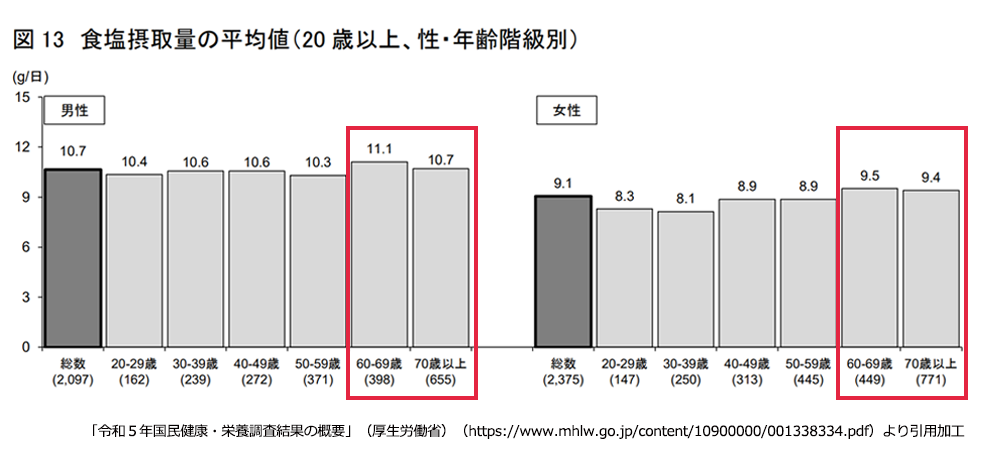 前項の通り、CKDの食事療法の一つに塩分制限があります。加齢とともに腎機能が低下していく中で、減塩を心がける方は多くいますが、厚生労働省の調査によると、年代別に見た食塩の平均摂取量は男女ともに60-69歳、70歳以上が最も多くなっています。