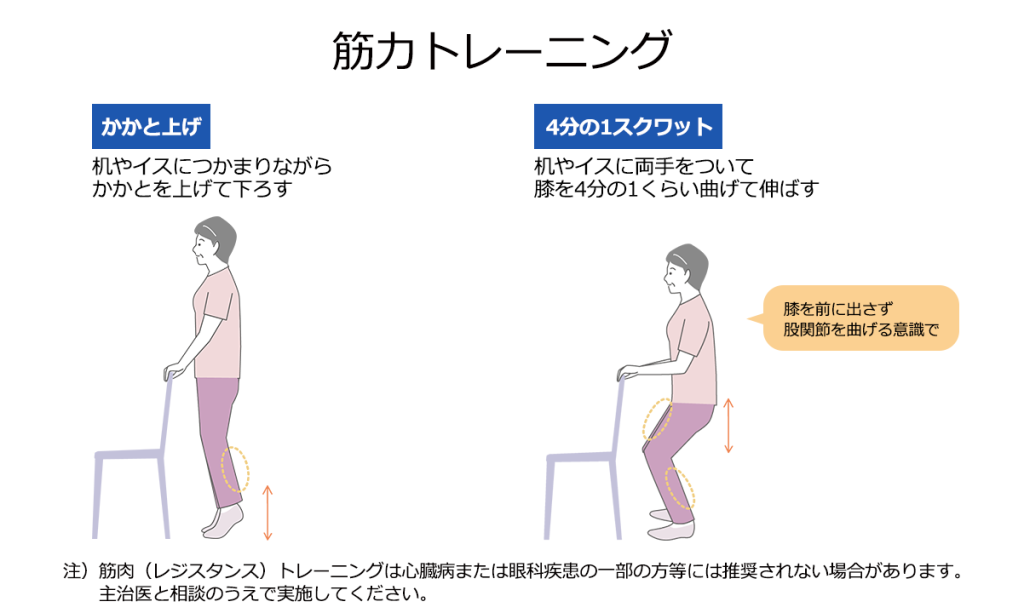 白筋の維持にはスクワットなどのレジスタンス運動が有効です。レジスタンス運動をするときは、反動をつけずにゆっくりとした動きで行いましょう。また、筋肉量が維持されるとはいえ、放っておけば赤筋も衰えていきますので、ウォーキングなどの有酸素運動で筋力を維持することが大切です。