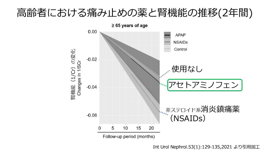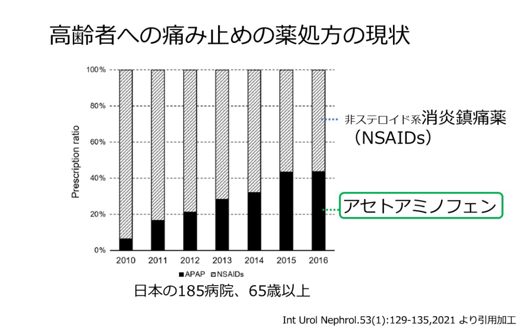 痛み止めや熱冷ましで使われるNSAIDs(非ステロイド性消炎鎮痛薬)には、腎臓に負担をかける作用が含まれているため注意が求められます。抗菌薬も、腎臓の働きに応じて減量する必要があります。このため、高齢者への痛み止めの処方の現状を見るとNSAIDsが減少し、腎機能への影響が少ないアセトアミノフェン(カロナール)が増加しています。