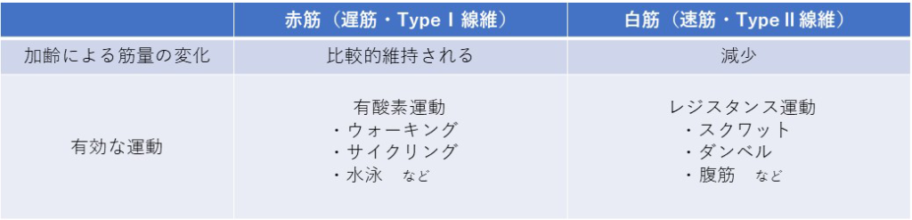 筋肉には赤筋(遅筋)と白筋(速筋)の2種類があります。赤筋は持久力に優れた運動で使われる筋肉で、赤身魚に例えられます。一方の白筋は瞬発力に優れた運動で使われる筋肉で、白身魚に例えられます。赤筋は年齢を重ねても比較的維持されるのに対し、白筋は減少していくという特徴があります。