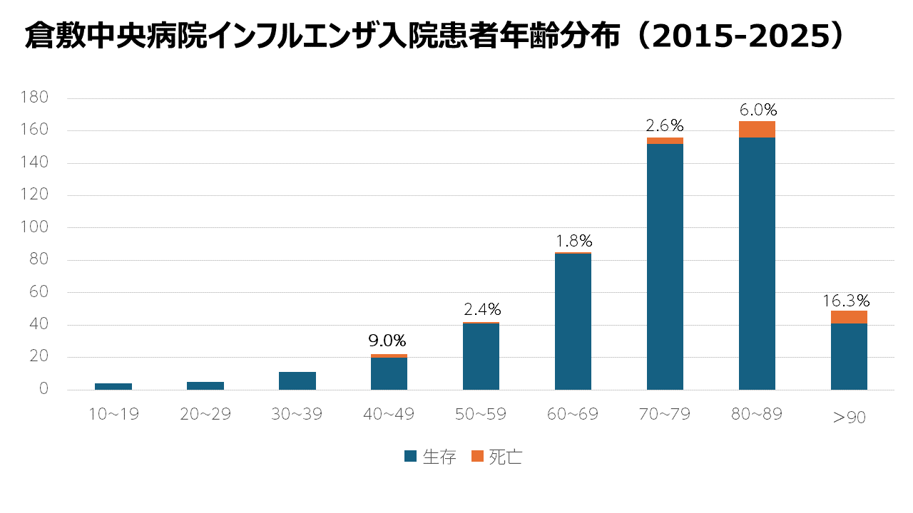 インフルエンザによる入院患者の主要な基礎疾患としては、慢性呼吸器疾患(肺気腫や喘息など)、慢性心疾患、糖尿病などが多く挙げられますが、基礎疾患のない健康な人でも一定数で重症化して入院するケースがあります。2015~2025年の当院インフルエンザ入院患者年齢分布を見ると、60歳以上から患者数が急増し、死亡率が占める割合も多くなります。気を付けなければならないのが、40歳台の方でも、重症化すると亡くなられる場合があることです。体調に不安を感じた際は、我慢せずになるべく早く医療機関を受診することが大切です。