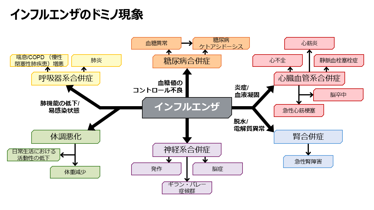 インフルエンザは呼吸器感染症にとどまらず、特に高齢者では主要な臓器に大きな障害をもたらす可能性があります。インフルエンザが引き金となって、合併症が次々と起こる「ドミノ現象」が知られており、肺炎、心筋炎、心不全、脳卒中、急性心筋梗塞、糖尿病の悪化などが挙げられます。中でも、インフルエンザに罹患すると、脳卒中のリスクは8倍、急性心筋梗塞のリスクは10倍に増加することが報告されています。