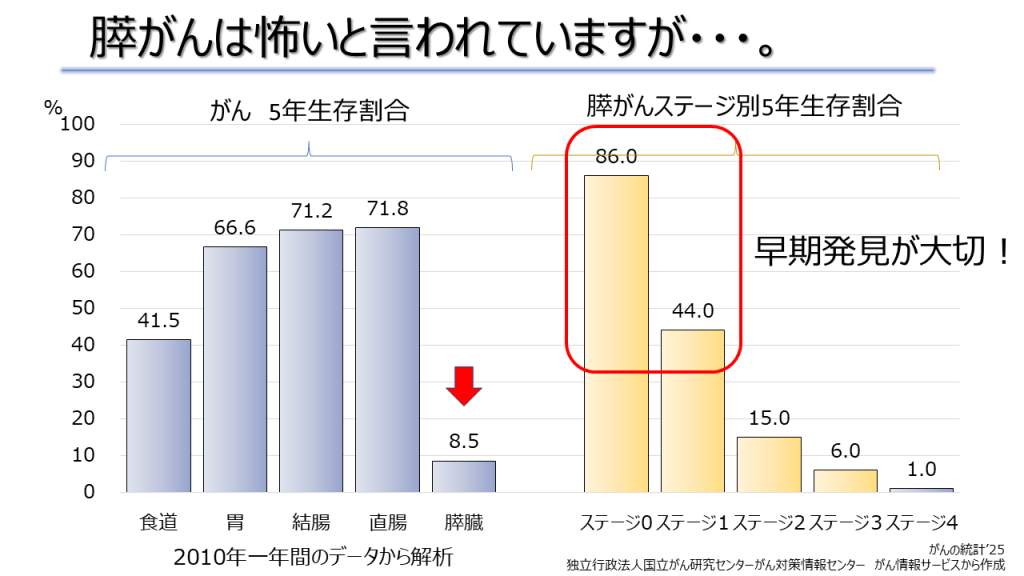 膵臓がんの予後は厳しいというイメージが強いですが、ステージによって生存率は大きく異なります。