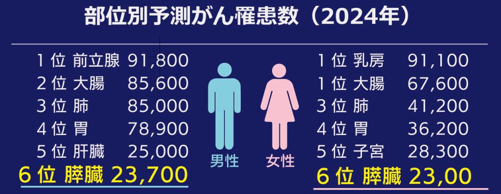 日本における膵臓がんの罹患者数は年間約4万人にのぼり、部位別のがん罹患数では男女ともに第6位となっています。膵臓がんは高齢化に伴って患者数が増えているがんの一つで、60代では2,000人に1人、70代では1,000人に1人が発症するというデータもあり、今後ますます注意が必要な疾患といえます。