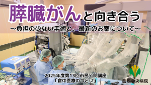 倉敷中央病院広報室のYouTubeチャンネルでは、2026年1月20日に増井先生が「膵臓がん」をテーマに解説した市民公開講座の動画を公開しています。WEBページに収まらなかった内容もありますので、下記のリンクバナーをクリックしてぜひご覧ください。
