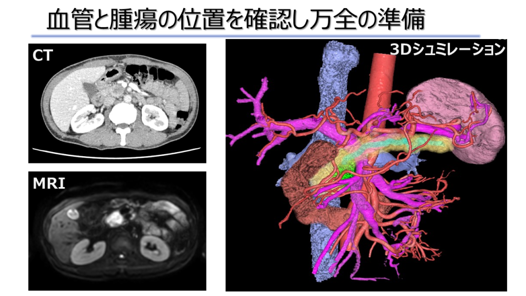 外科治療で最も重要なのは、「目に見えない広がりまで予測し、がんを確実に取り切ること」です。膵臓の周囲には重要な血管や神経が密集しているため、術前に3Dシミュレーション等で血管と腫瘍の位置関係を詳細に把握し、万全の準備を整えます。