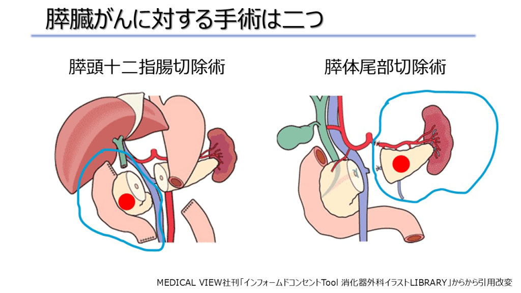 膵臓がんの手術は、腫瘍ができる場所(膵頭部か、膵体部・膵尾部か)によって、大きく二つの術式に分けられます。