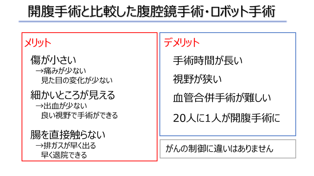 • 回復が早い:腸を直接触らないため動きの回復が早く、早ければ2週間前後での退院も可能です。