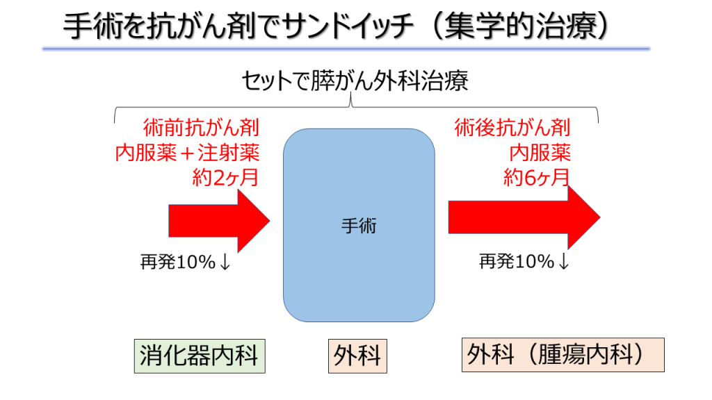 現在は手術単独ではなく、手術の前後に抗がん剤治療を実施する「集学的治療」が標準です。膵臓がんでは手術前に約2か月、手術後に約6か月の抗がん剤治療を実施することで、再発率をそれぞれ約10%ずつ抑える効果があります。このような治療方針は、外科、消化器内科、腫瘍内科、放射線治療科などの専門家が集まる「キャンサーボード(合同カンファレンス)」で決定します。チーム医療による多角的な検討により、生存期間に関するリスクが24%改善するというデータも示されています。
