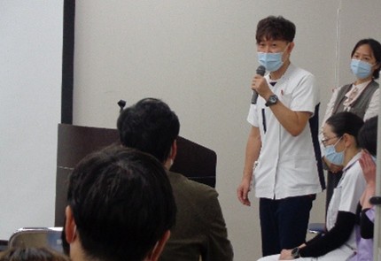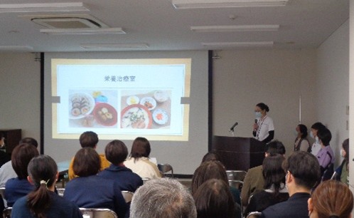 今回のプログラムは前回同様、1題目と2題目は同じ構成で進行しました。まず、安西医師による訪問診療の症例報告が行われ、続いてリハビリテーション・栄養・口腔領域の多職種連携について講演しました。2題目では、リハビリテーション室・栄養治療室・歯科診療支援室の各室長が登壇し、各部門の役割や具体的な取り組みに加え多職種で実施しているカンファレンスやミールラウンドの実際について詳しく紹介しました。質疑応答では、地域包括ケア病棟でのリハビリ提供の状況に関する質問が寄せられました。当院からは、整形外科手術後の患者さんや、他院からリハビリ目的で来られる方が多いこと、また状態が安定している場合は入院当日からリハビリを開始することが多い旨をお伝えしました。