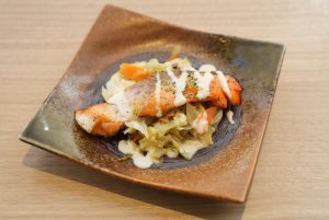 主菜のサーモンの漬け焼きは、味噌を加えた調味料に漬け込むことで魚の旨味を引き出しています。