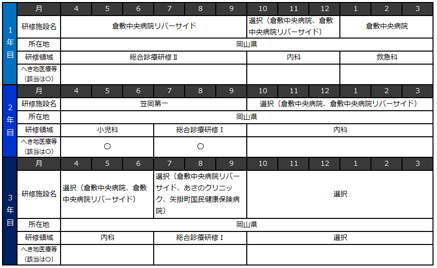| 例1: | 倉敷で研修を開始するパターン: 倉敷中央病院 1年9ヶ月 → ふじおか形成外科・美容外科 3ヶ月 → 広島市民病院 1年 → 島根県立中央病院1年 |