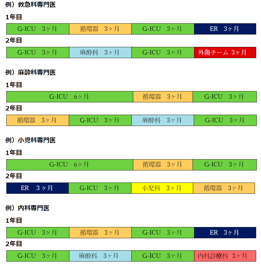 独立した診療科として集中治療部門での研修に集中できる環境を提供する一方で、それぞれの基本専門領域などで必要な診療経験があれば柔軟に対応します。2年間の研修後はスタッフとして採用され、勤務を継続する選択肢もあります。